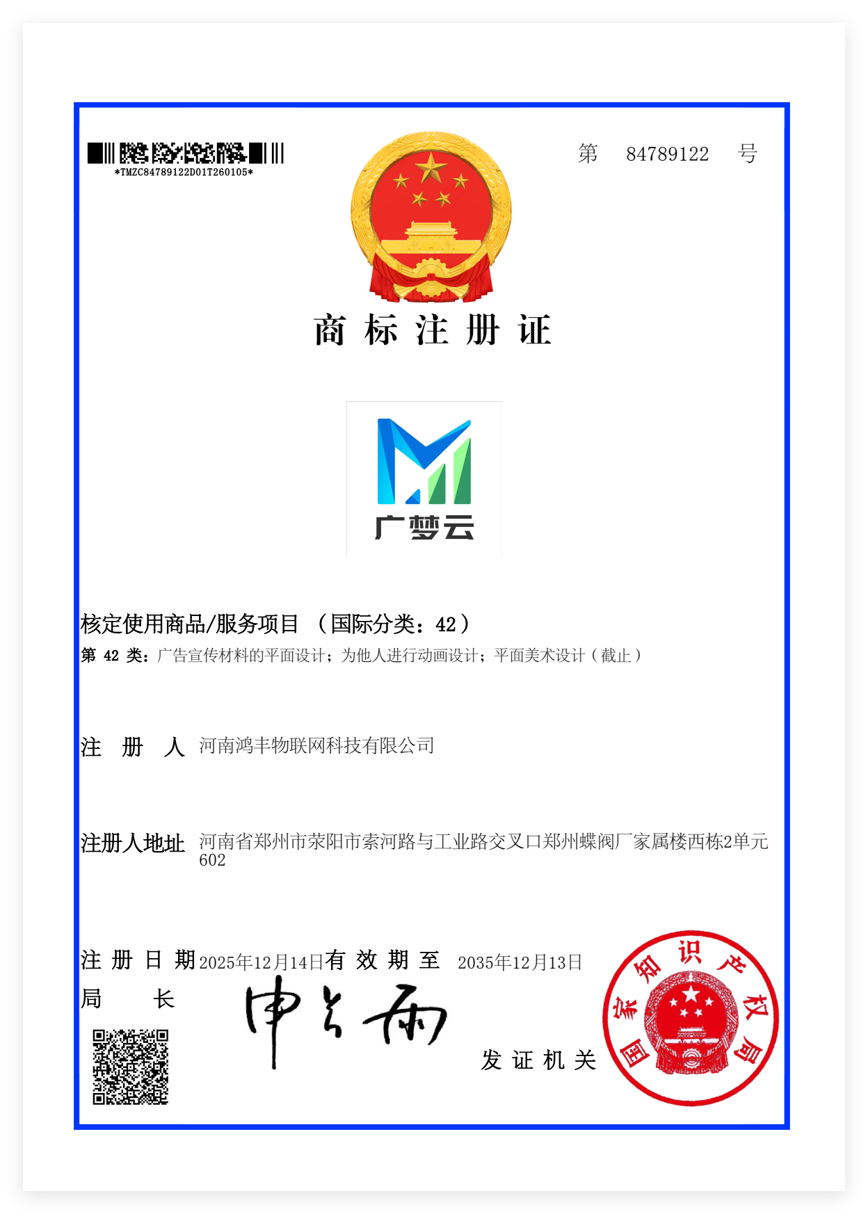 - 河南鸿丰物联网科技有限公司为 广梦云渠道销售系统 产品的开发商,依法独立拥有产品著作权(中华人民共和国国家版权局著作权登记号 2025SR0066078)。
