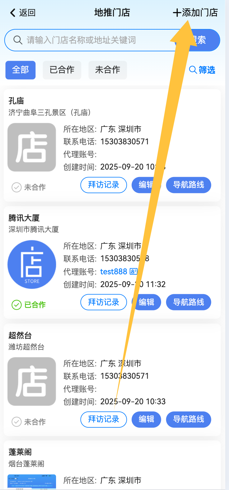 • 当业务员首次到店后,不论是否确定合作关系,都可以将门店信息收集并添加到系统中,以便于总平台了解业务员工作进度和合作情况
