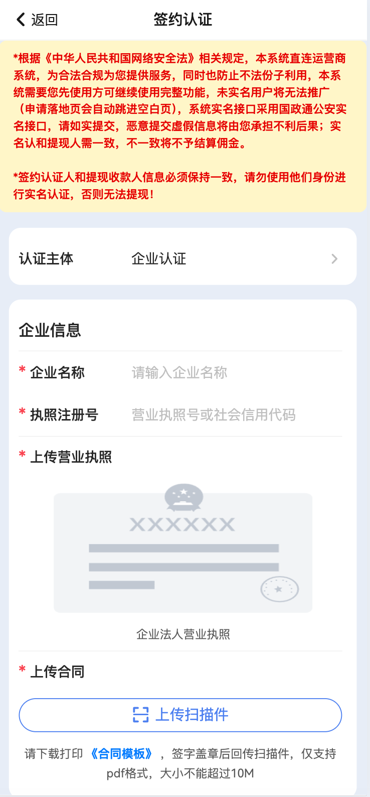 企业合同模板 | 企业合同暂不支持电子签约模式:代理商需下载平台上传的合同模板,打印纸质版签署后上传扫描件;后续平台审核无误,将打印签署并回传双方已签署的合同扫描件。认证通过后,双方均可在 “签约认证” 模块下载合同文件 |