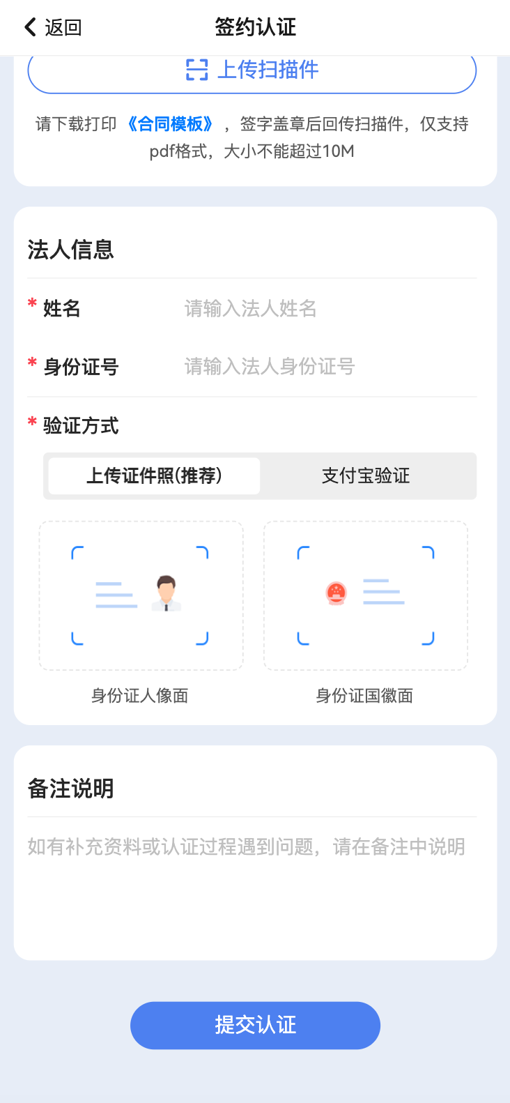 - 为简化流程理解、提升演示效率,代理商侧流程统一按商户端演示;实际操作中,代理商也可在 PC 端完成认证,且流程与商户端基本一致,故不再单独演示