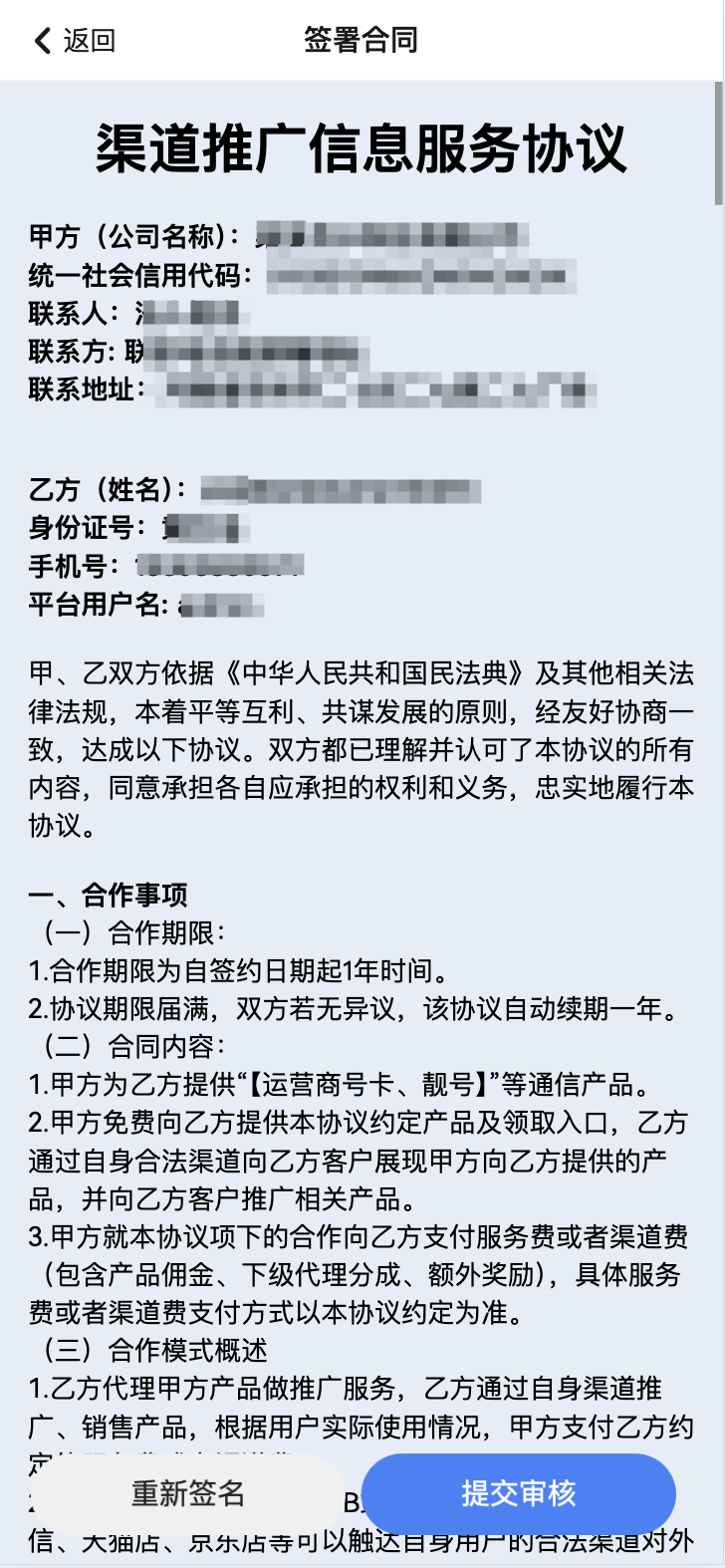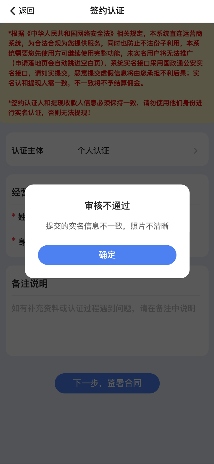 - 代理商提交审核后,若系统已开启自动过审功能,且提交信息验证无误,将自动通过审核;若未开启自动审核,则需后台人工审核确认。若审核不通过,系统会提示代理商未通过原因,代理商可整改后重新提交审核