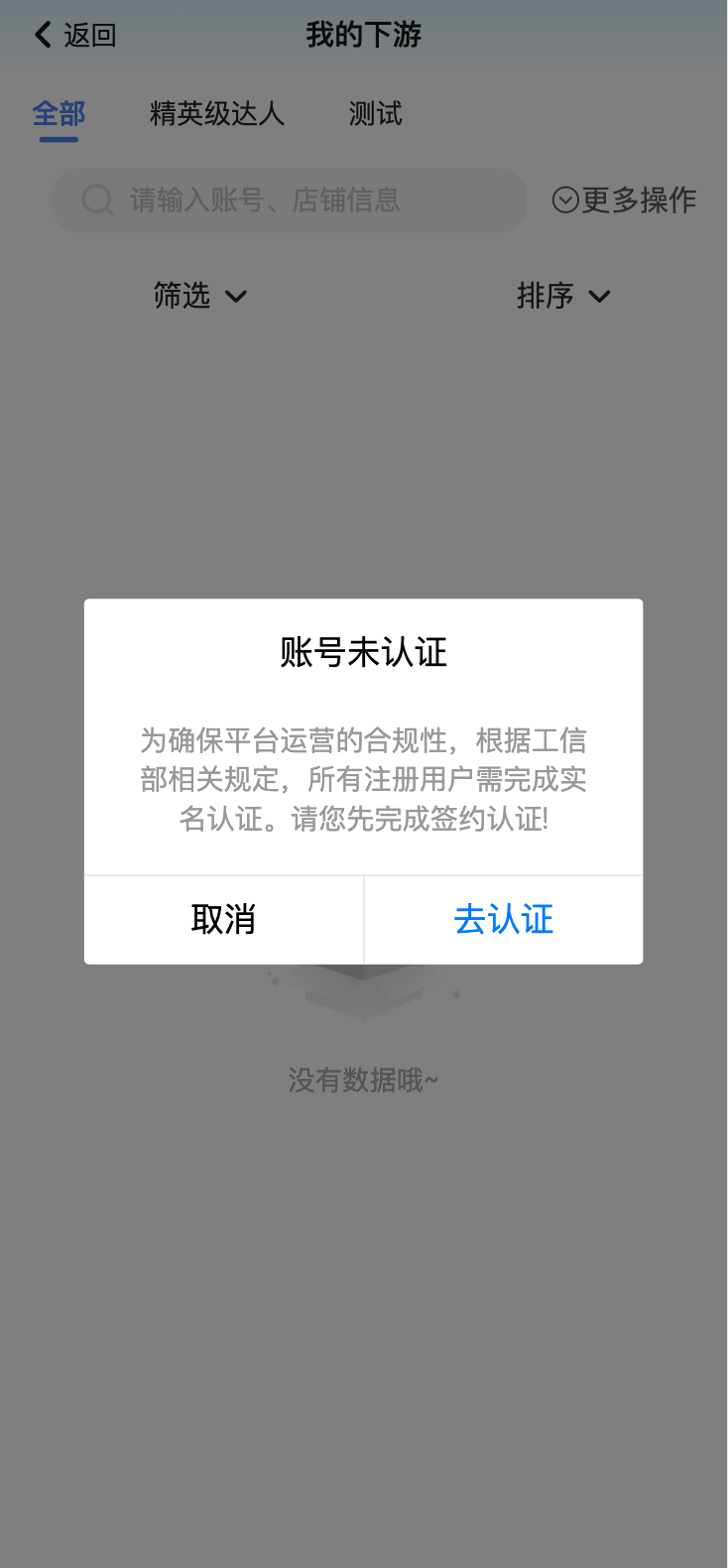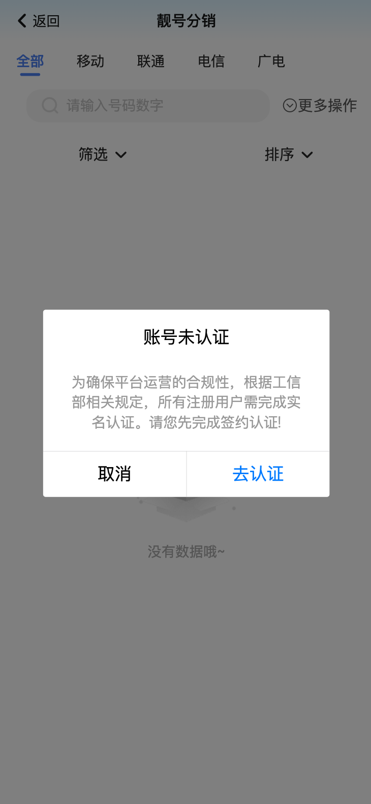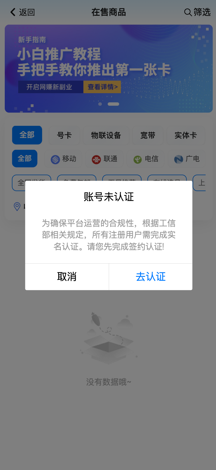 - 若未认证则不允许查看下游代理商、在售商品列表、商品详情、靓号列表、物联套餐等分销功能数据,会弹出弹窗提醒并引导用户前往认证