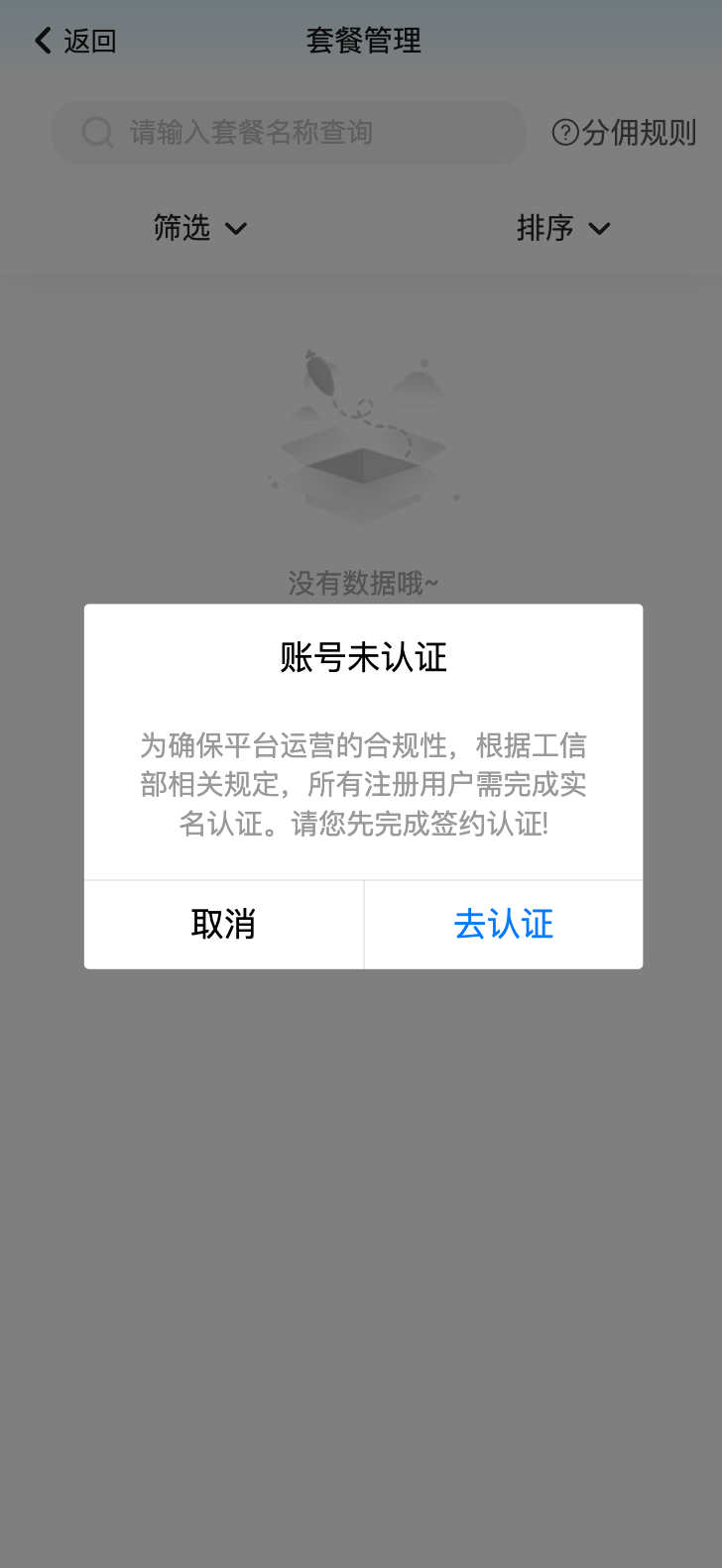 - 若未完成签约认证会弹出弹窗提醒并引导用户前往认证