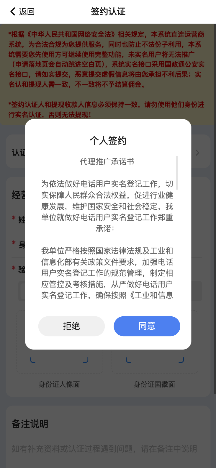 企业认证提示内容 | 代理商选择 企业认证时,弹出的确认内容。代理商必须同意否则不允许下一步操作 |