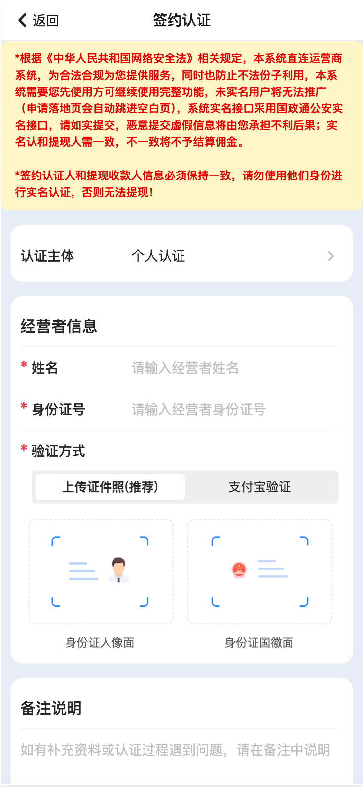 签约认证通知内容 | 签约认证页面顶部的文字提示,一般可以写签约认证的一些细则和提现相关的,比如签约认证同时需要到灵活用工账号侧同步绑定账户信息 |