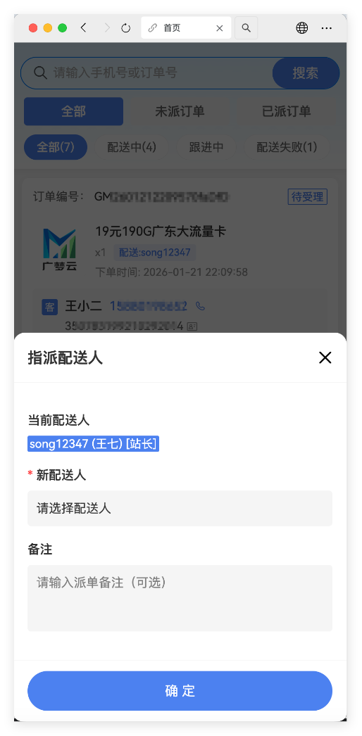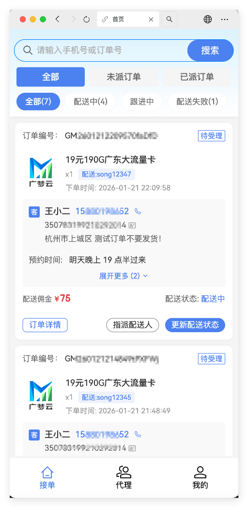 号卡、宽带、靓号线下订单等需要上门安装/办理业务的配送人员管理,可实现多层级权限/分销/指派/配送,目前已集成完整的行业配送状态流转