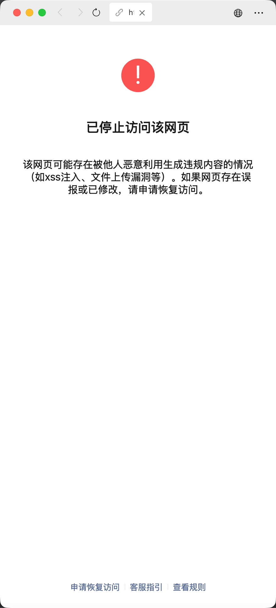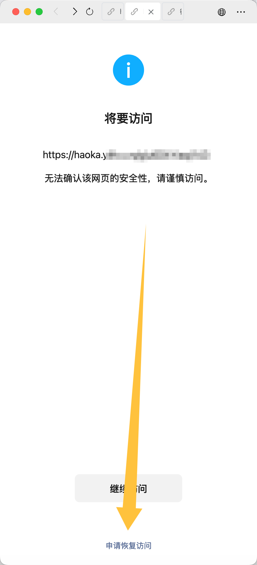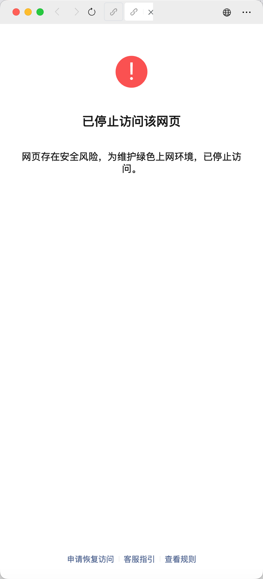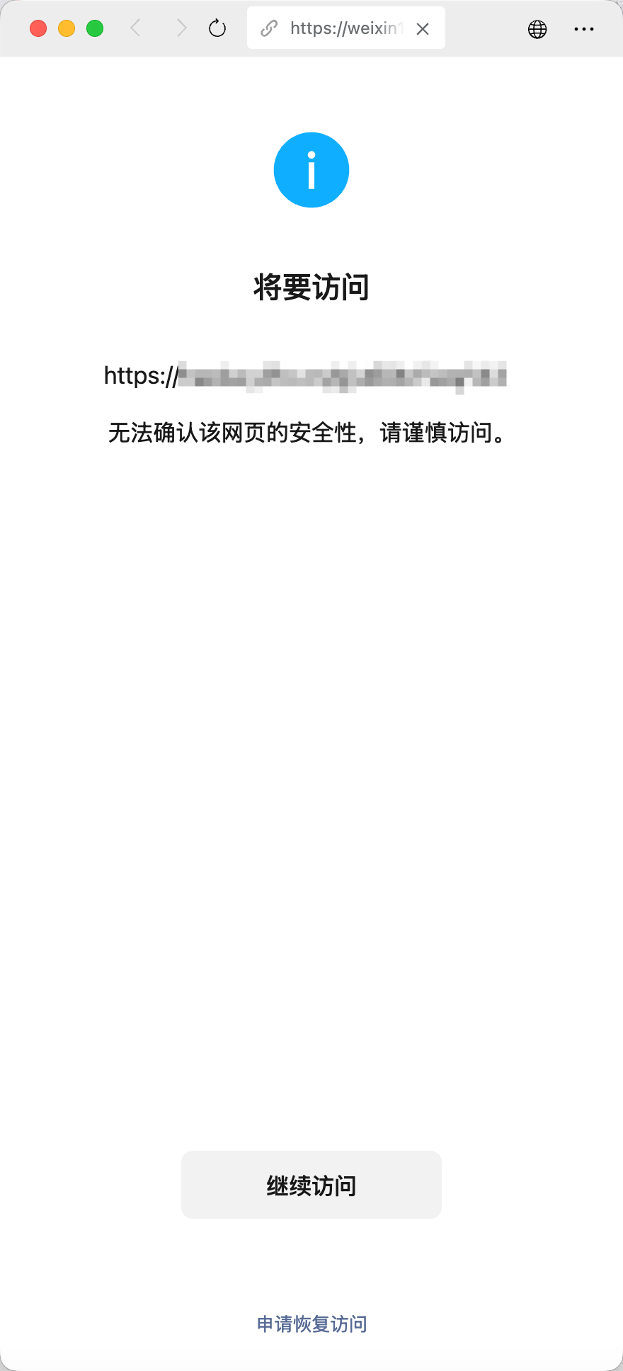 在微信中访问违规网站时会被拦截在以下页面,可以点击申请恢复访问进行申诉。