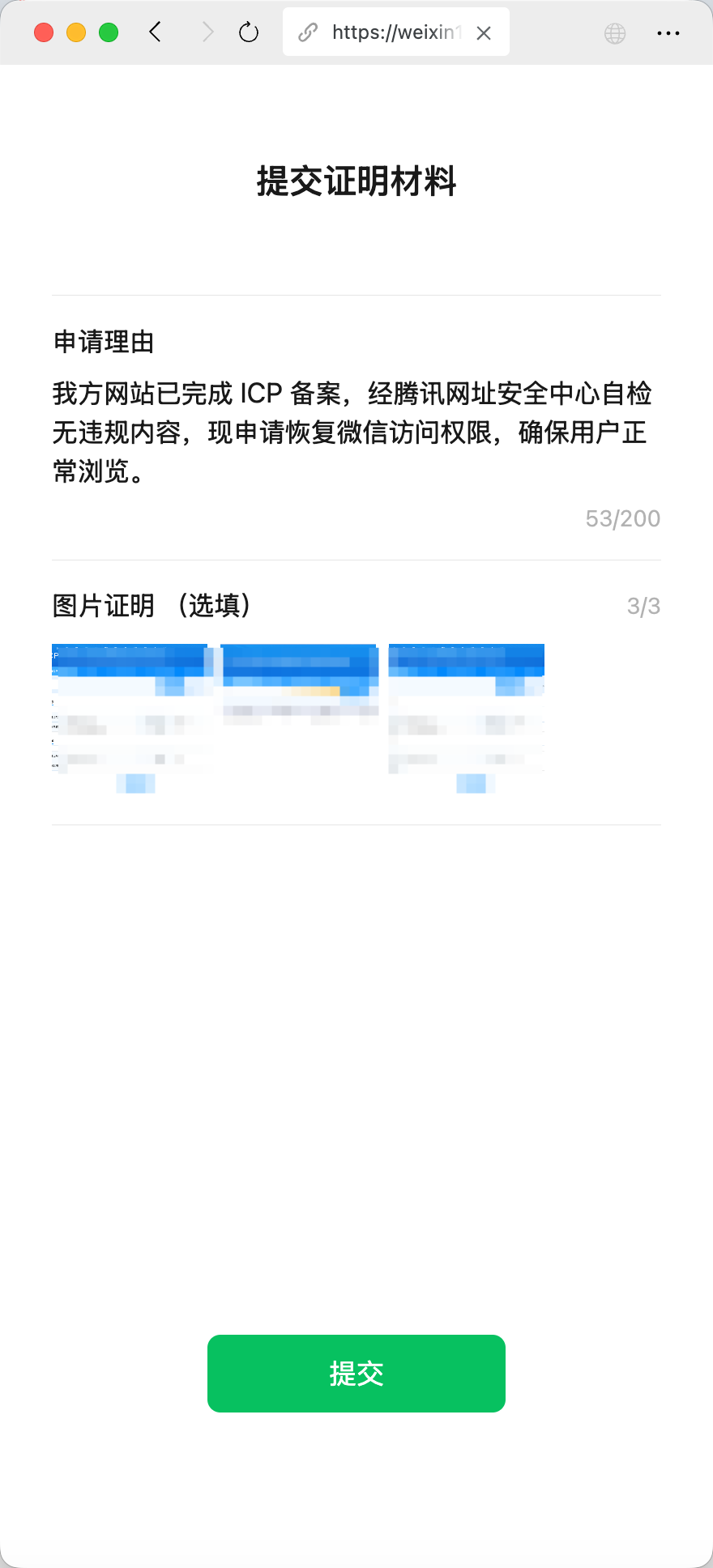 申请理由:我方网站已完成 ICP 备案,经腾讯网址安全中心自检无违规内容,现申请恢复微信访问权限,确保用户正常浏览。