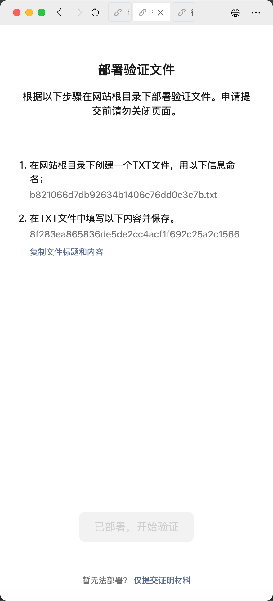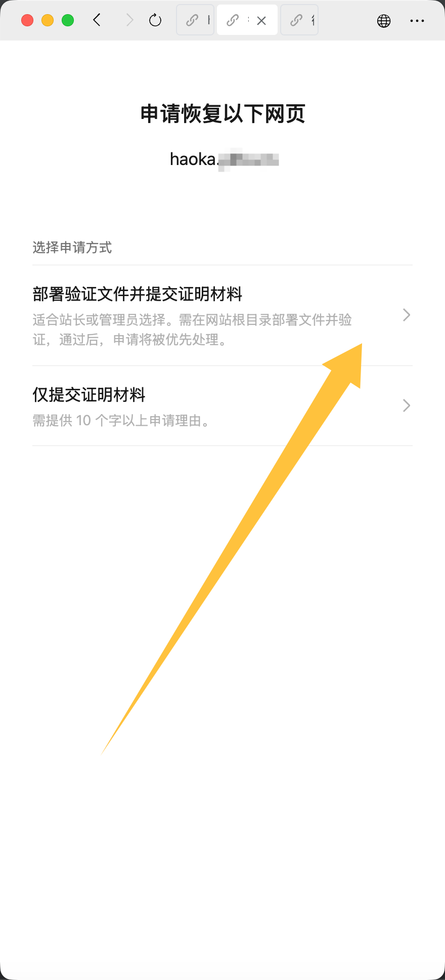步骤:访问拦截网站地址 → 点击申请恢复 → 部署验证文件并提交证明材料 → 把提示的验证文件在你电脑本地创建出来 → 上传到系统根目录 → 验证无误提交证明材料