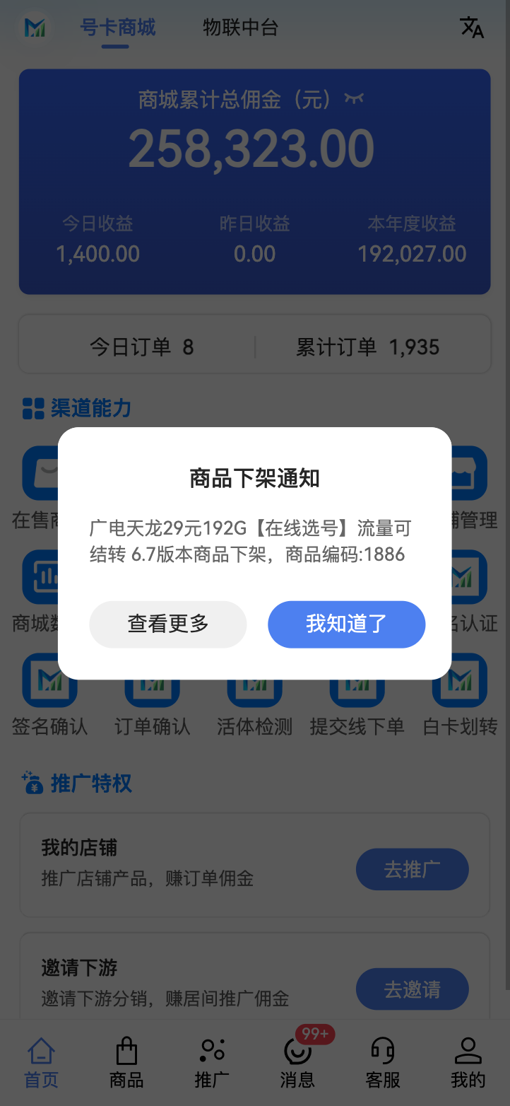 - 商品上架时,会推送全局的通知提醒,所有代理商都可以实时接收到
