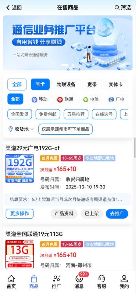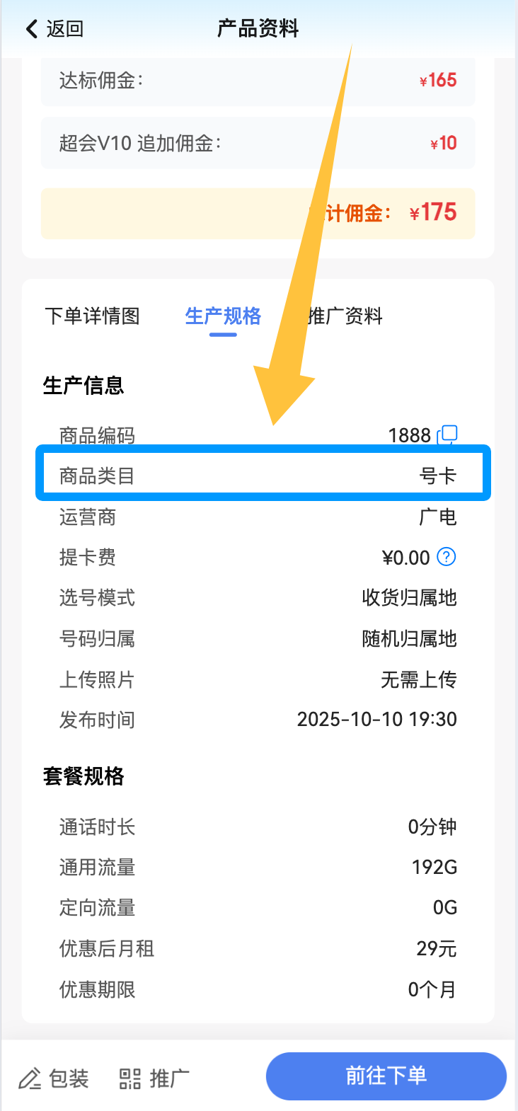 - 以下简单展示号卡类目商品上架后,在商户端与店铺端的效果。其他类目仅存在少量特殊参数或功能差异,此处不单独展示,实际效果为准