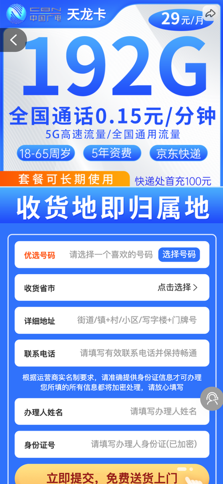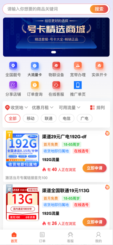 号卡 | 销售常规线上号卡产品,可自动化对接上下游下单、订单状态同步、结算佣金等线上操作 | 线上办理号卡新入网 |